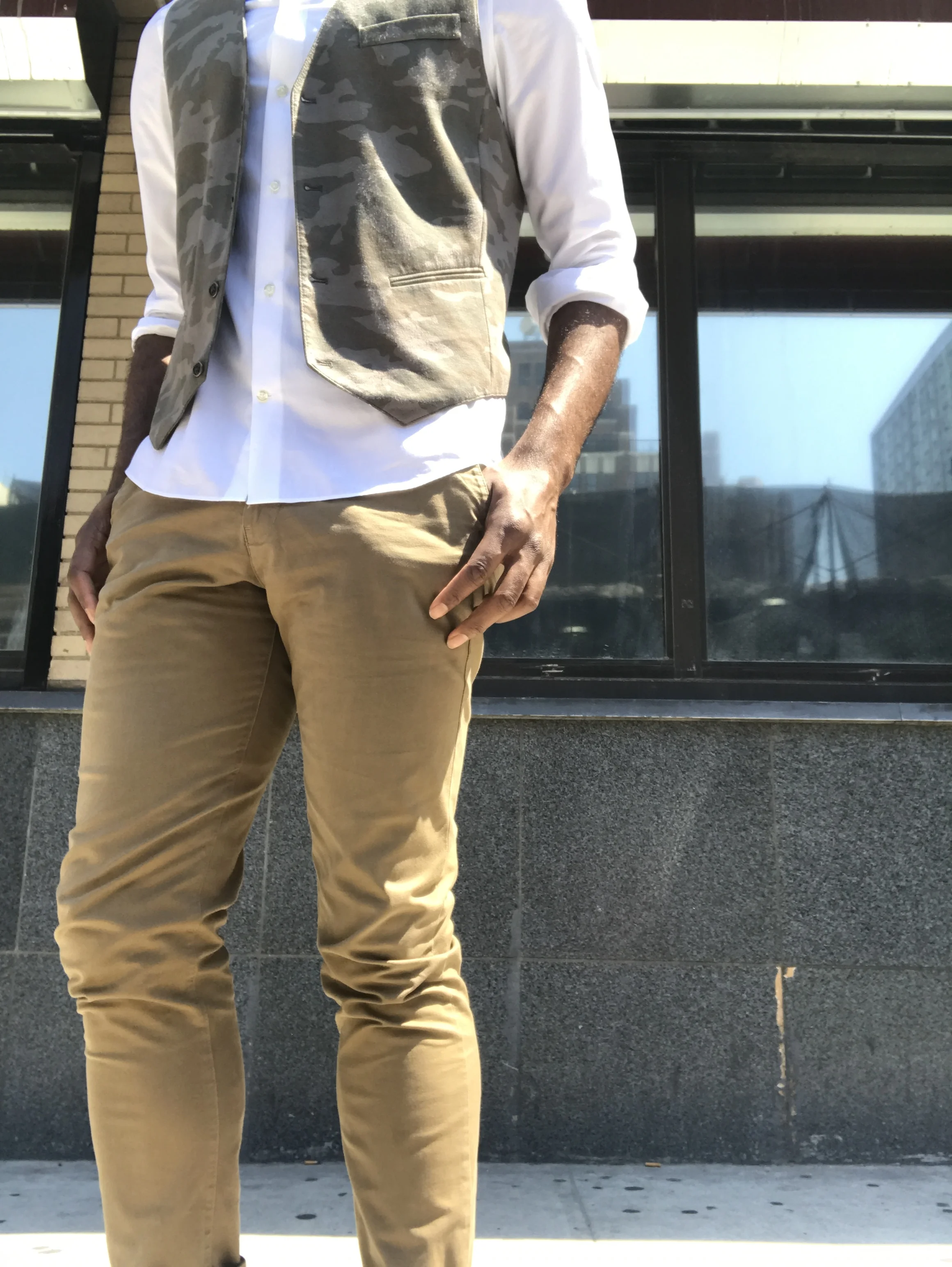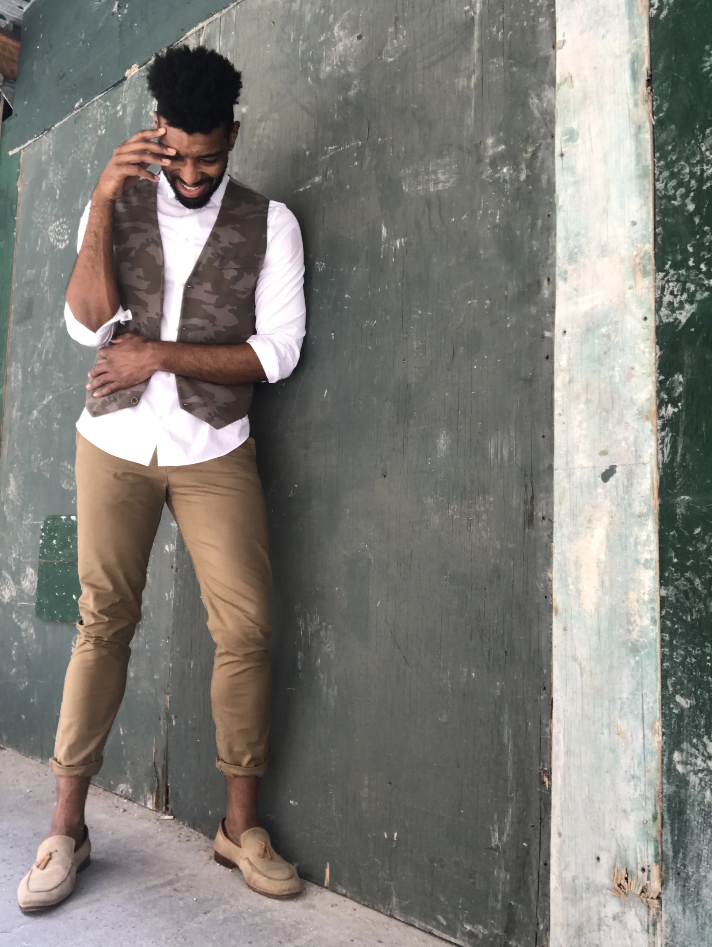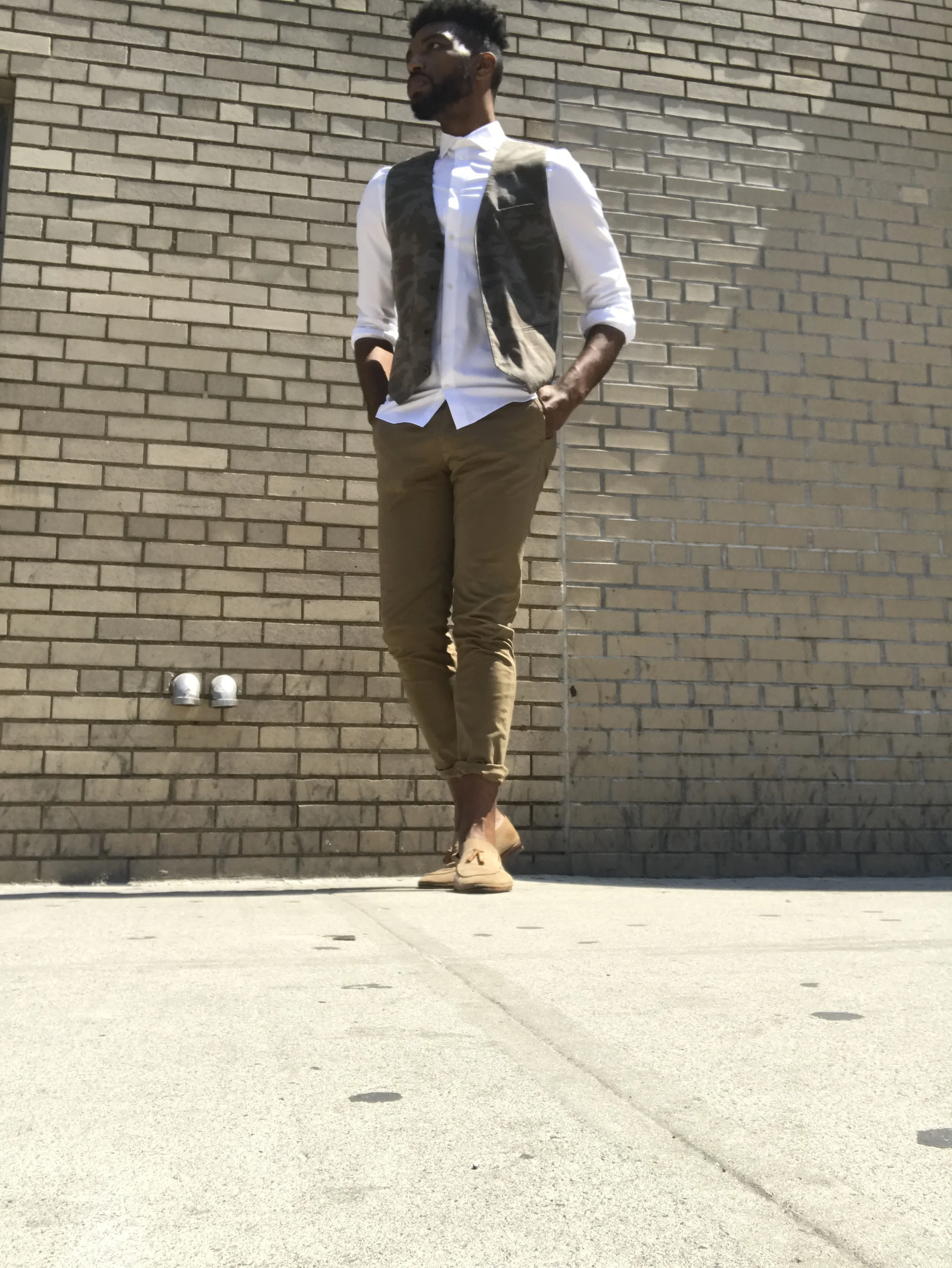 I used to think that making an impact with fashion was all about standing out by wearing unique pieces or vibrant eye catching colors. The thought of a neutral color palette and earth tones seemed a little boring to me back then. But as my style has grown I have come to appreciate a more toned down structured look that is far from boring. I believe in wearing the clothes and not letting the clothes wear me. I got this camouflage vest a few years ago and I was drawn to it because the colors were understated and the pattern added a playful twist to a more formal vest. I paired the vest with a classic spread collar white shirt, khaki chinos and my favorite beige suede tassel loafers. This look made me feel refined and pulled together and even though camouflage is designed to help you blend in to your surroundings, I feel like I stood out just fine.